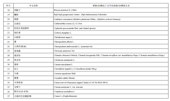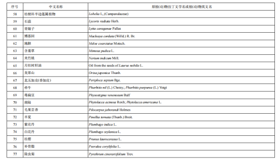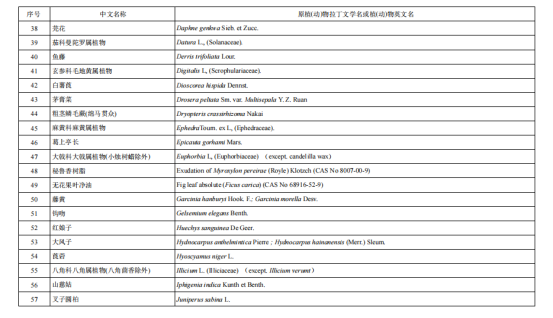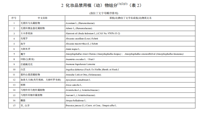 從上述原料要求中,并沒有明確哪類植物提取物是不可以加入到抗(抑)菌制劑原料中的,但要求中明確了列入現(xiàn)行有效的《化妝品安全技術(shù)規(guī)范》(碘除外)的禁用物質(zhì)不能用于抗(抑)菌制劑的原料,而《化妝品安全技術(shù)規(guī)范》中有明確的《化妝品禁用植(動(dòng))物組分》表,而列于該表中的植物成分就不可以用到抗(抑)菌制劑的原料中,現(xiàn)將組分表分享如下: